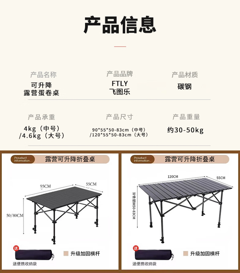 商品名称:(巨邦佑)BH+露营可升降蛋卷桌-大号:DJZ0502 便携野餐桌子露营用品烧烤桌