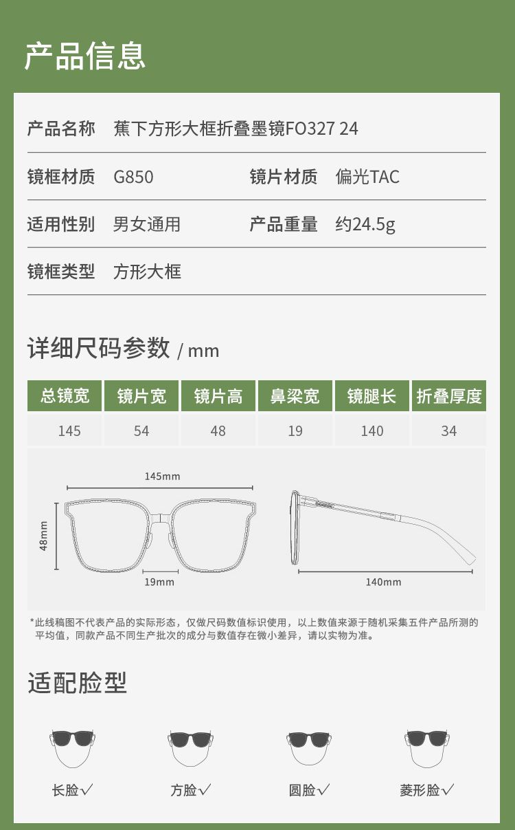 商品名称:(巨邦佑)T+蕉下方形大框墨镜FO32724可折叠户外防晒轻便防紫外线偏光太阳镜