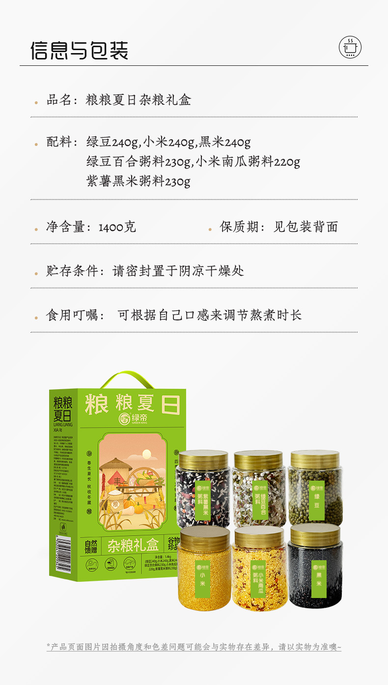 商品名称:(世星阳光)绿帝粮粮夏日杂粮礼盒1.4kg 元气谷物 甜糯可口 六种食材 独立罐装