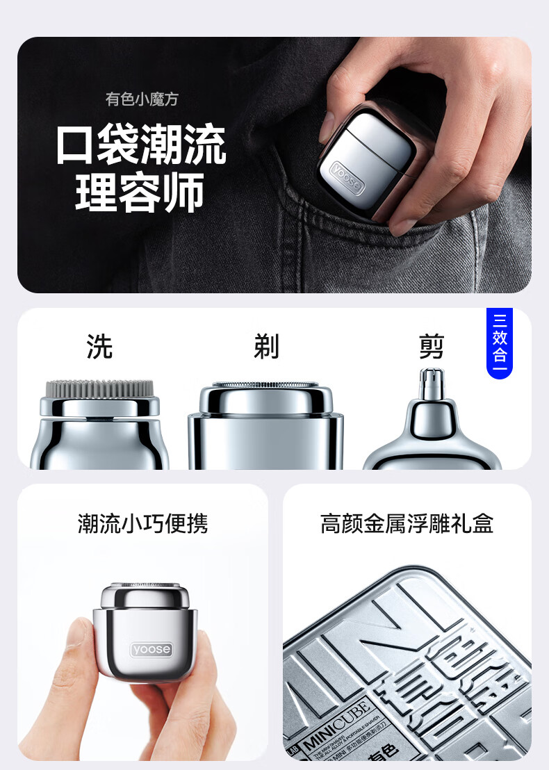 商品名称:(超运·禾贸)小魔方理容套装 D1-S 电动剃须刀 便携刮胡刀修鼻毛洁面仪三合一 生日礼物520送男朋友