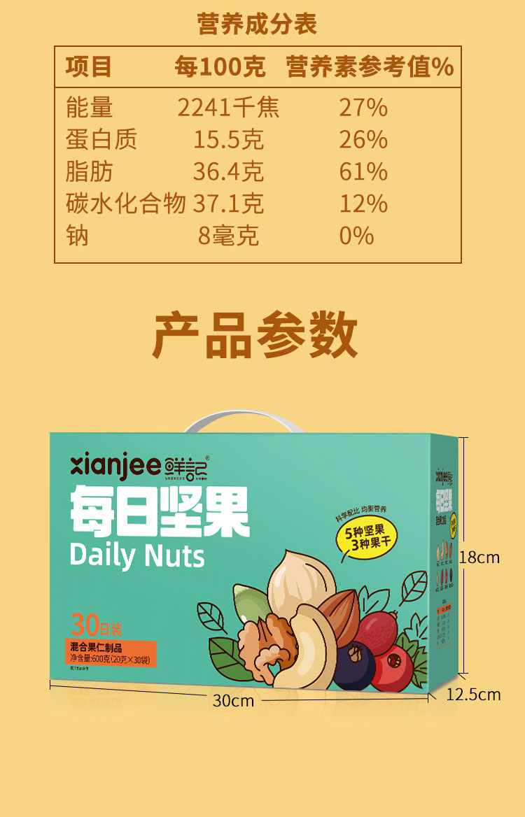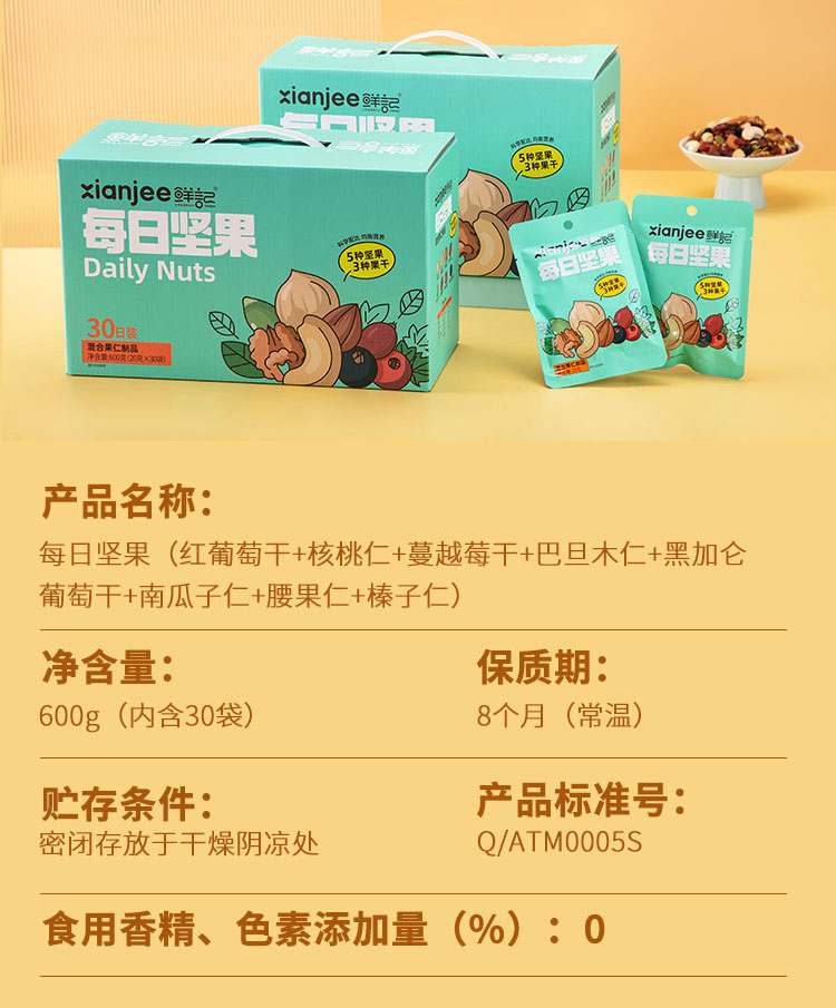 商品名称:(中合誉品)鲜记每日坚果600g(20g*30袋)科学配比
