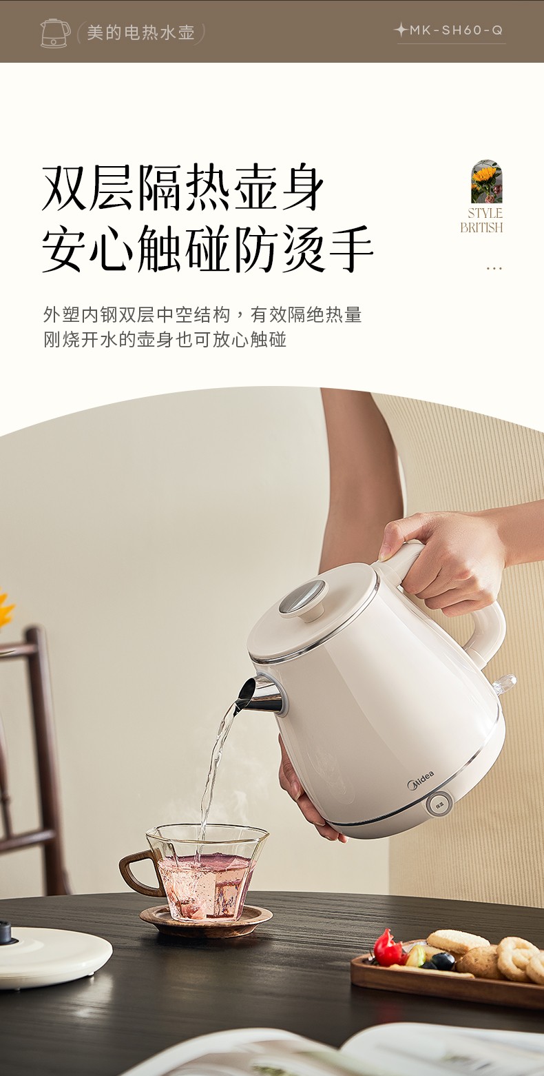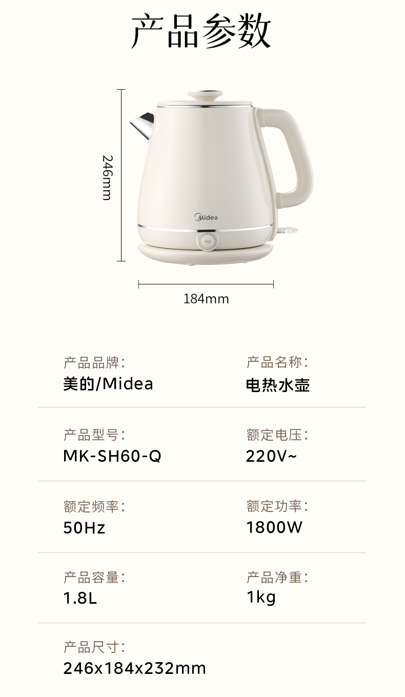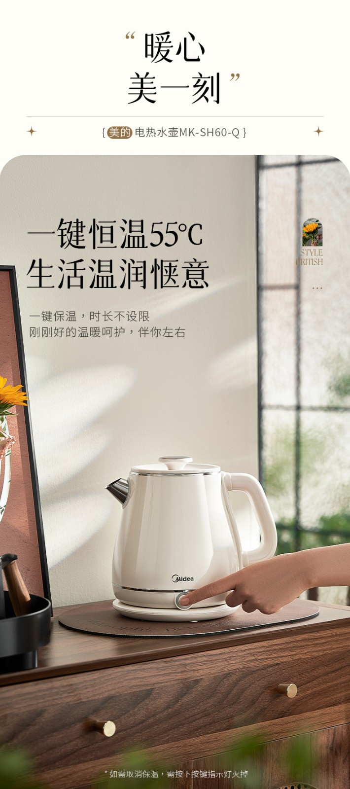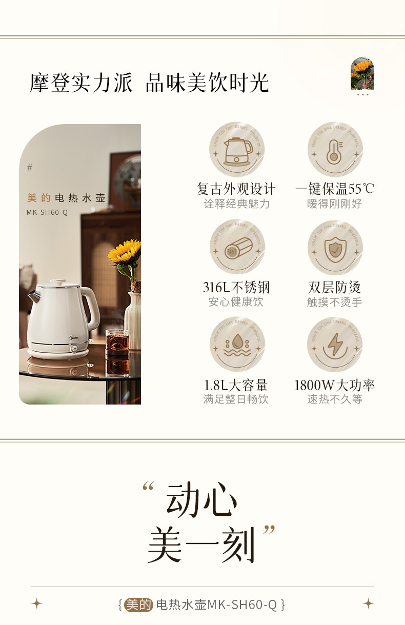 商品名称:(巨邦佑)R+美的(Midea)电热水壶 SH60-Q316L母婴级不锈钢电水壶 家用大容量烧水壶 一键恒温55℃ 双层防烫开水壶 1.8L 【复古系列】