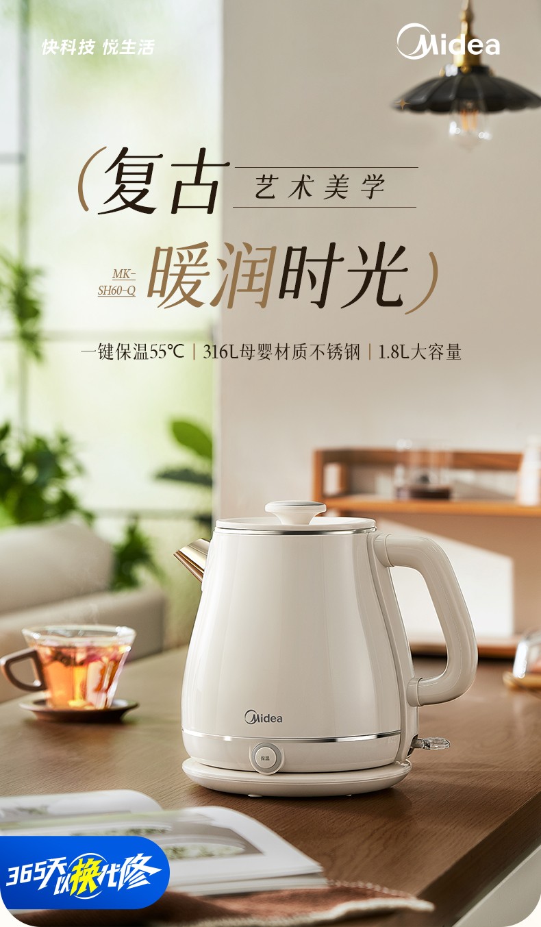 (巨邦佑)R+美的(Midea)电热水壶 SH60-Q316L母婴级不锈钢电水壶 家用大容量烧水壶 一键恒温55℃ 双层防烫开水壶 1.8L 【复古系列】