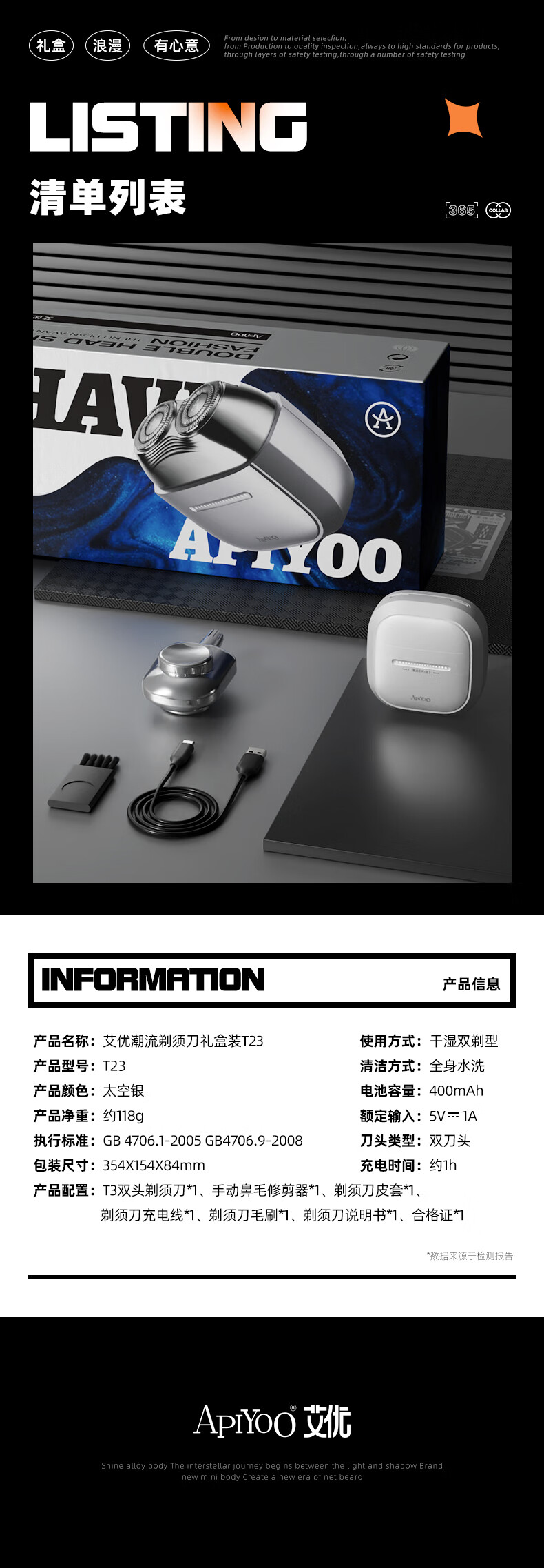商品名称:(巨邦佑)BJ+Apiyoo艾优潮流剃须刀礼盒装T23银 滑动触控开关顺滑柔和不伤肤