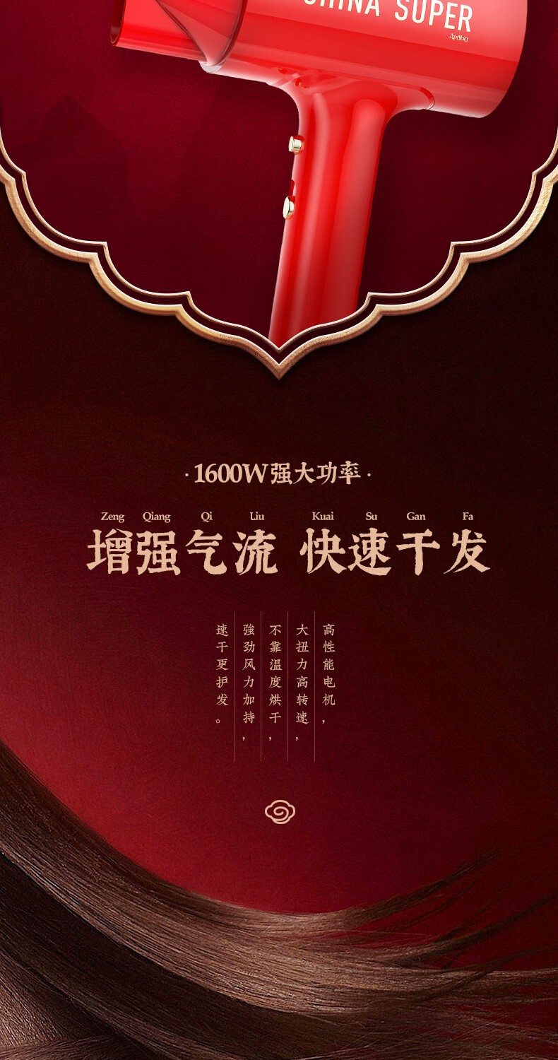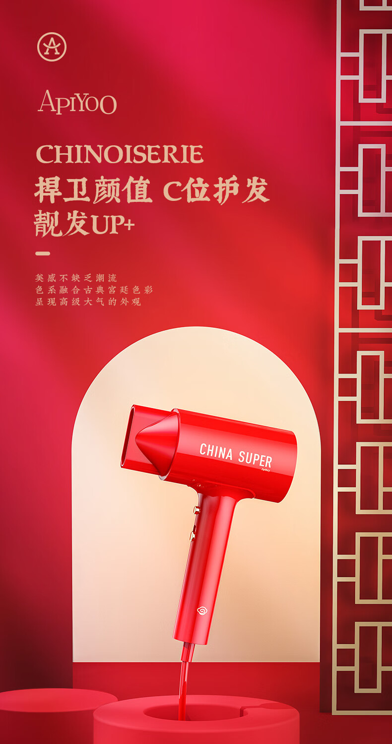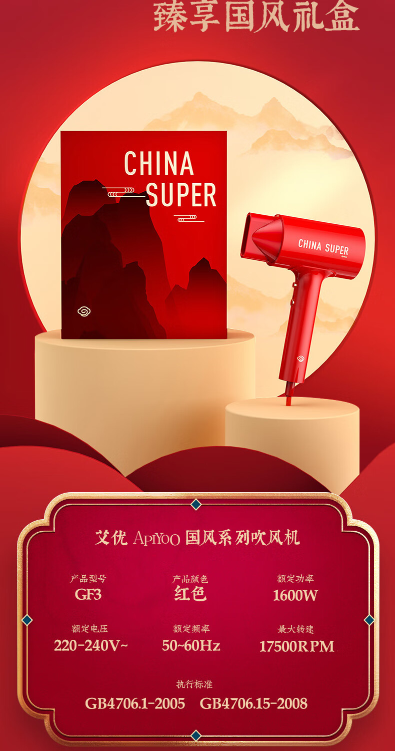 商品名称:(巨邦佑)BJ+Apiyoo艾优国风吹风机GF3 中国红国潮负离子吹风筒速干恒温1600W大功率