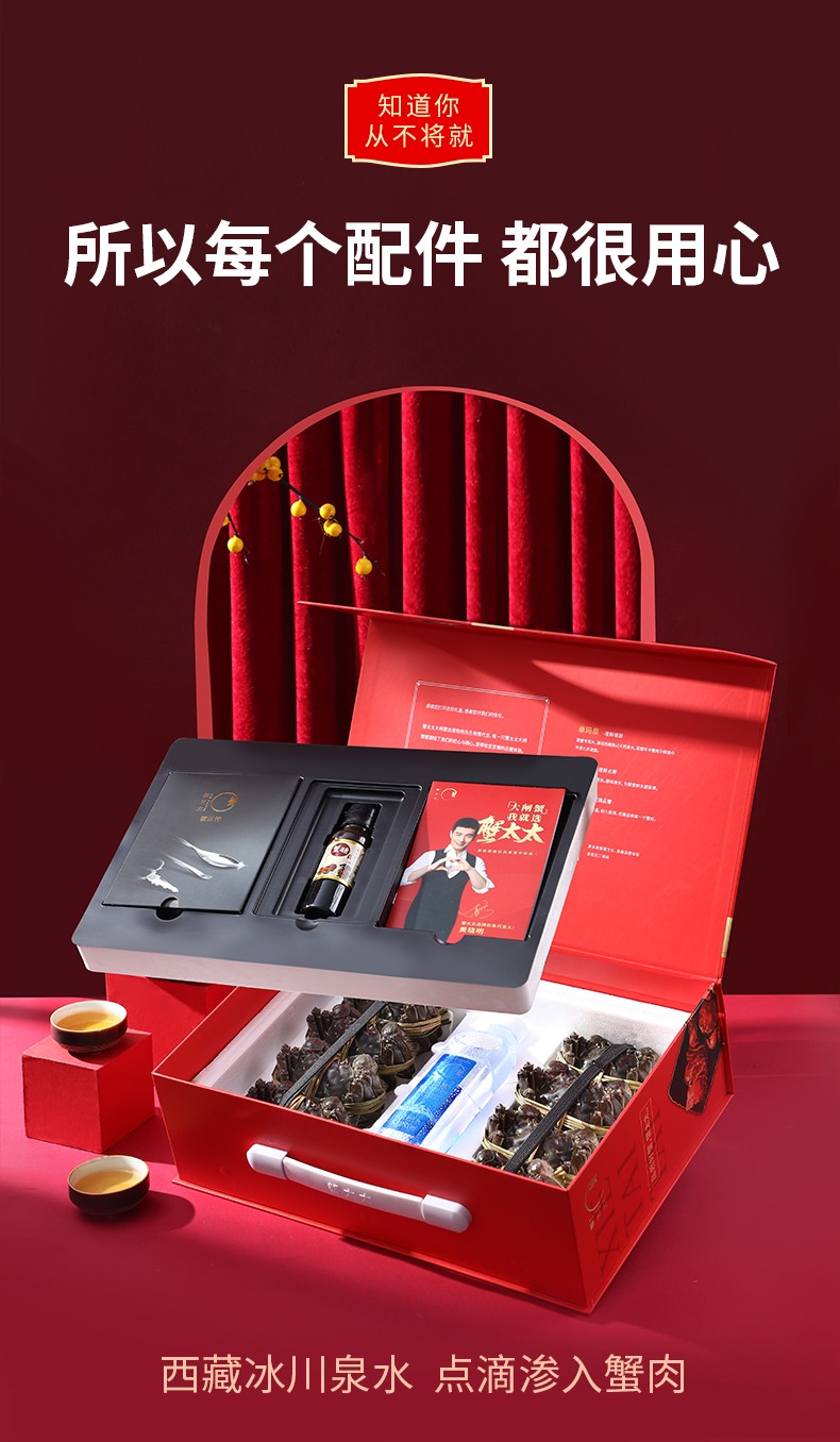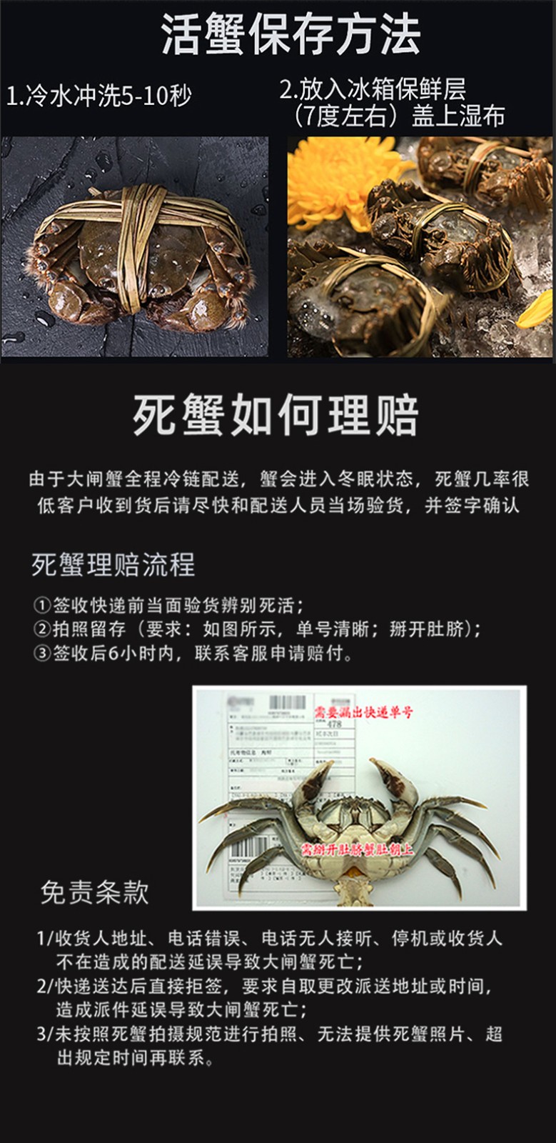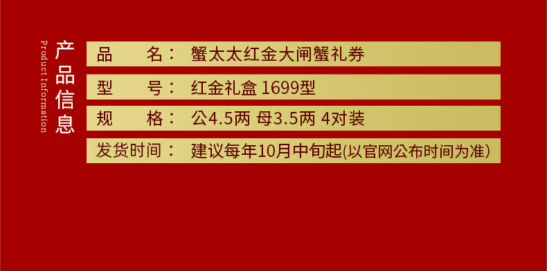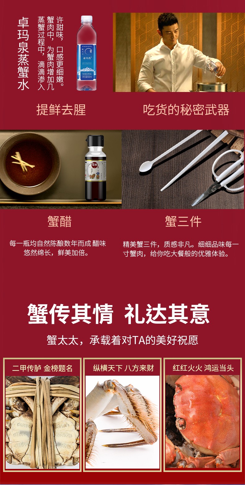 商品名称:(世星阳光)蟹太太 红金 4对装 1699型 公4.5两 母3.5两 蟹大 肉甜 黄多 附带吃蟹工具 蟹醋