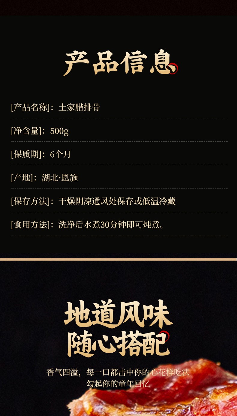 商品名称:(世星阳光)九月穰恩施特产腊仔排 土家腊排骨500g 柴火烟熏 甄选小排 无大骨色泽鲜明 美味不腻