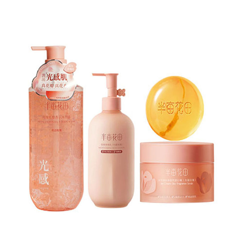 商品名称:(世星阳光)+半亩花田花瓣清洁倍润呵护玫瑰磨砂膏苦参皂四件套KJ07 沐浴露500g 身体乳250ml 净螨皂100g 磨砂膏250g 看得见的花瓣 闻得到的花香 给予肌肤 净澈清洁 温和不刺激 一冲即净