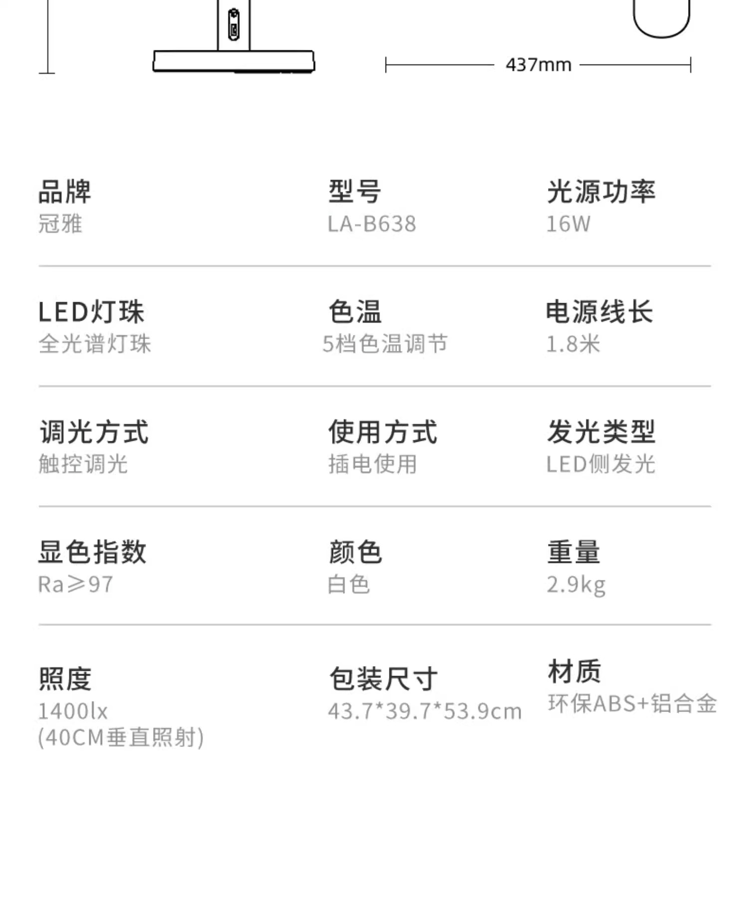 商品名称:(巨邦佑)BJ+冠雅 全光谱护眼台灯 LA-B638 16W新款客厅儿童学生用全光谱眼台灯阅读学习灯
