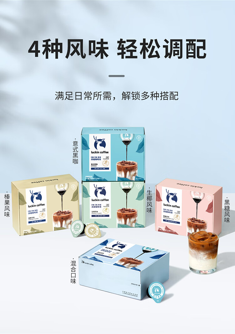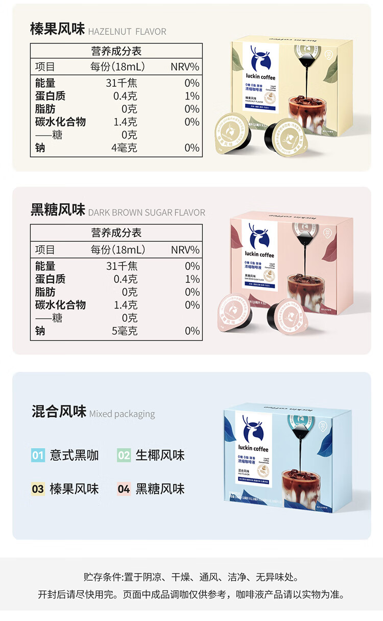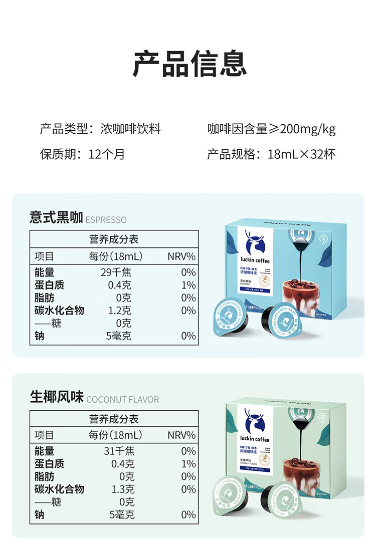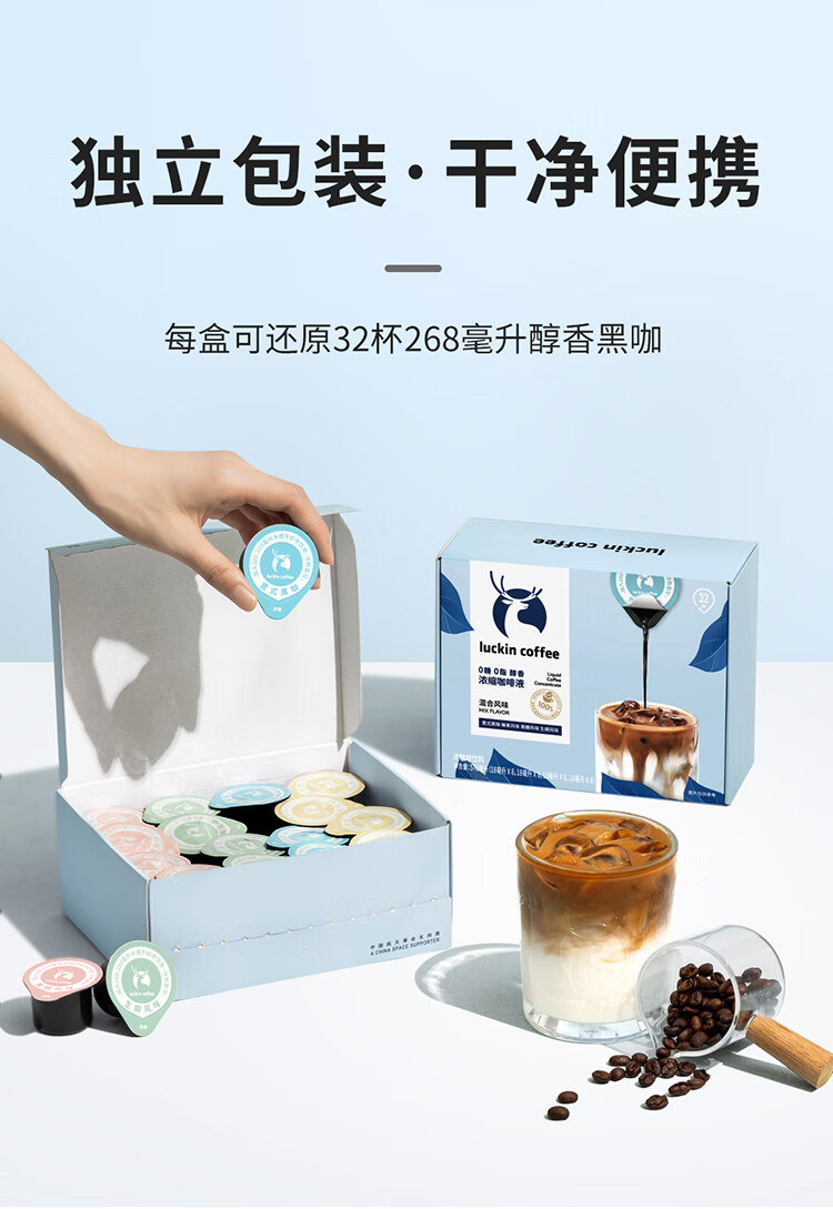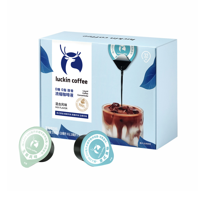 商品名称:(超运·禾贸)瑞幸【咖啡液】0糖0脂醇香浓缩咖啡液-混合口味 18ml*32颗盒 瑞幸【咖啡液】0糖0脂醇香浓缩咖啡液-混合口味 18ml*32颗/盒 浓缩咖啡液意式黑咖