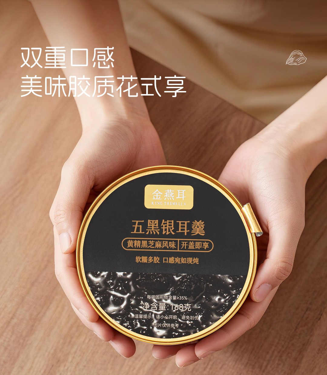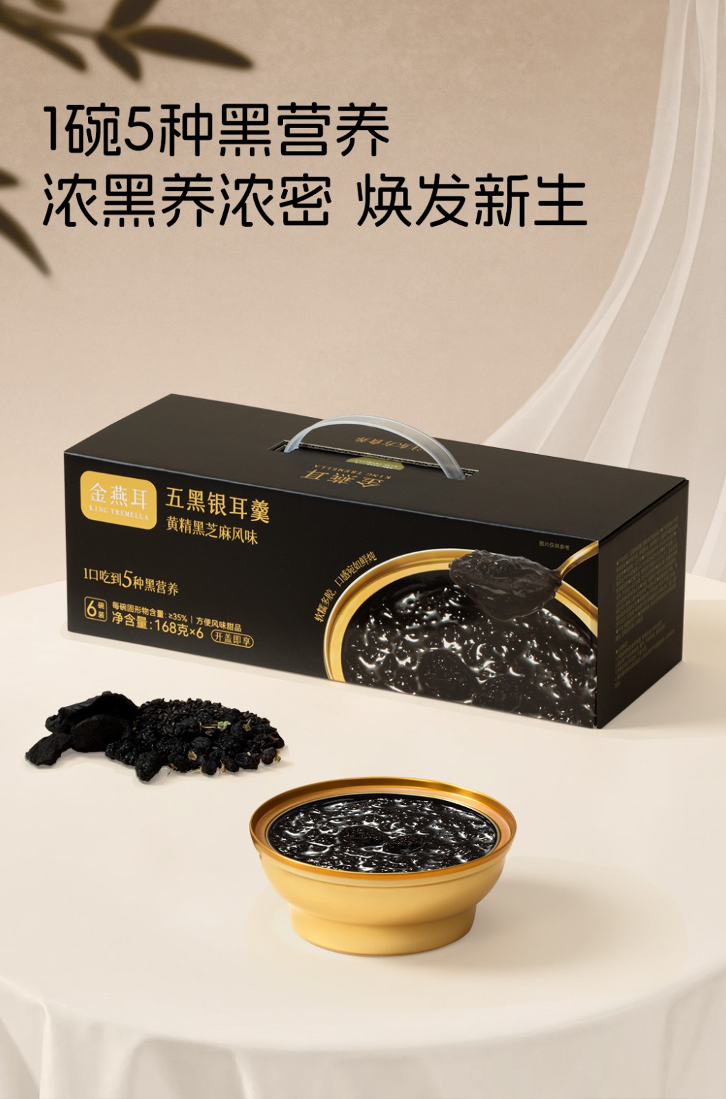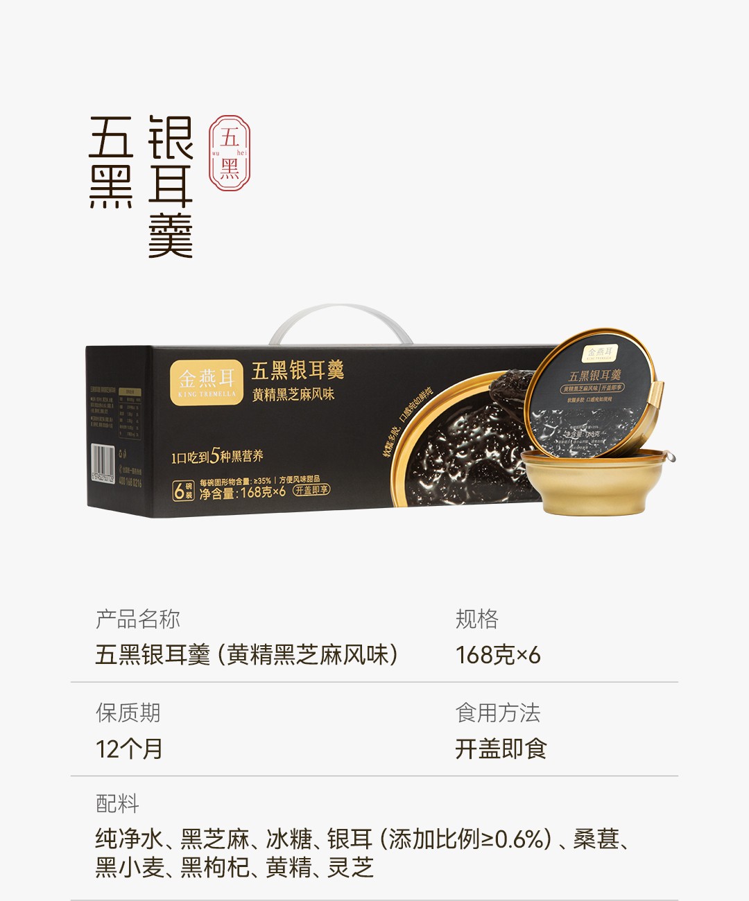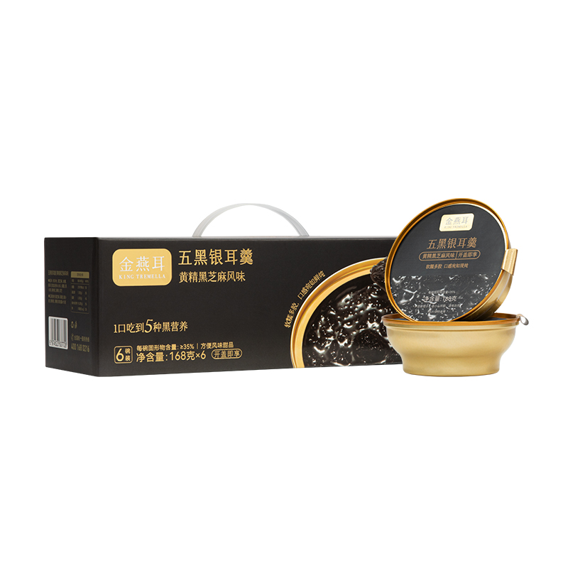 商品名称:(汇景缘)金燕耳K五黑银耳羹(黄精黑芝麻风味)168g*6碗盒 生态银耳鲜炖银耳羹礼盒即食早餐