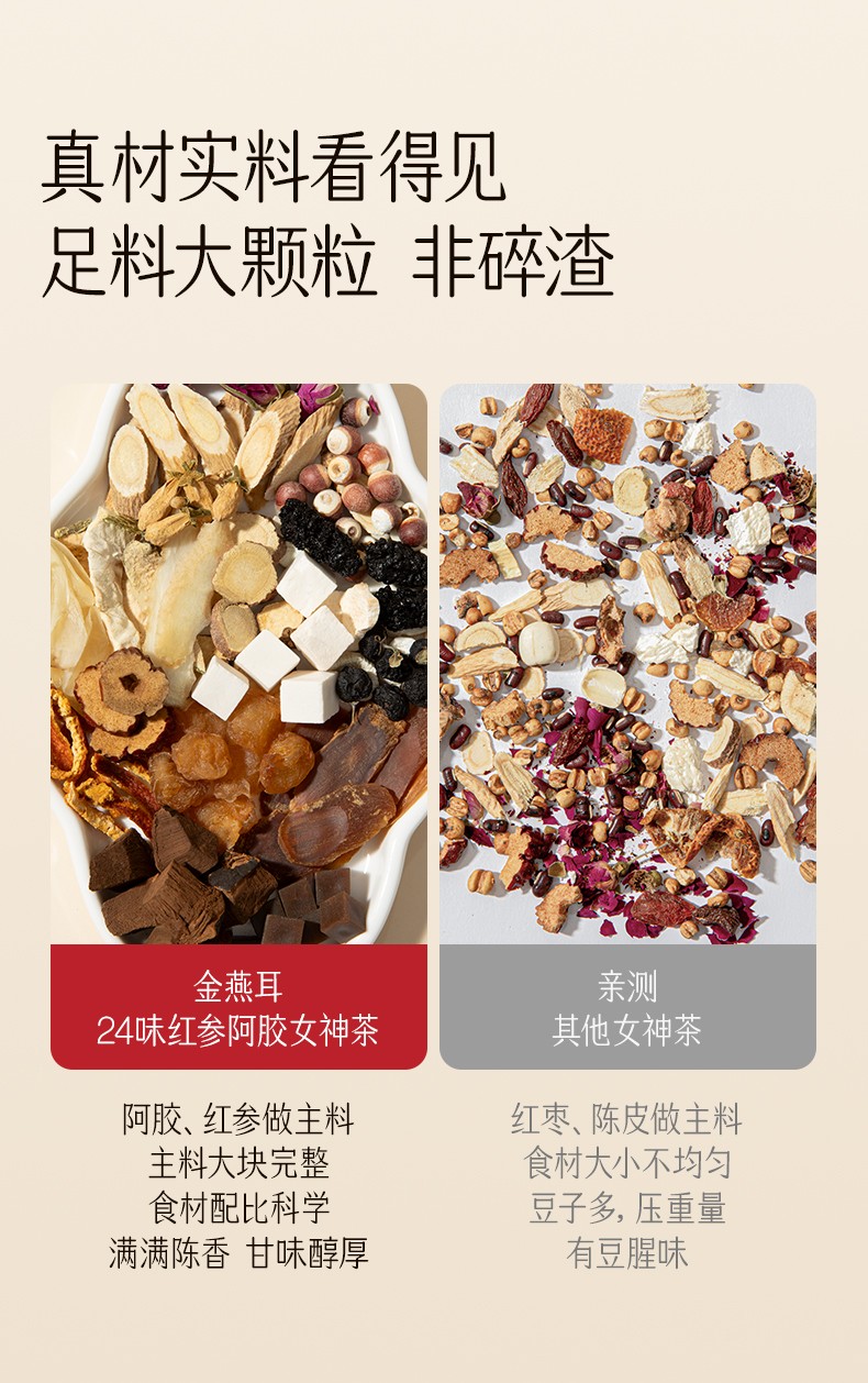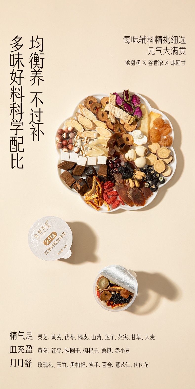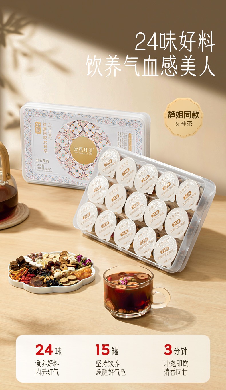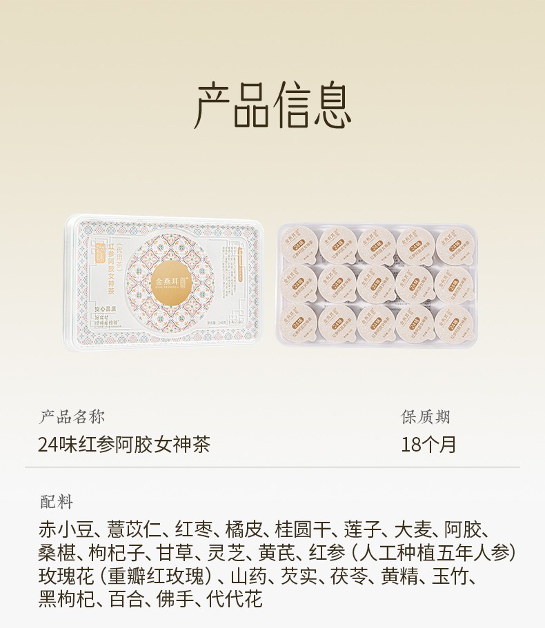 商品名称:(汇景缘)金燕耳K24味红参阿胶女神茶 16g*15罐 红枣桂圆玫瑰花24味调理养生花茶