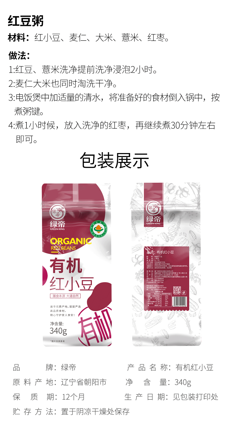 商品名称:(世星阳光)+绿帝有机红小豆340g*2袋 严格挑选 绵糯可口