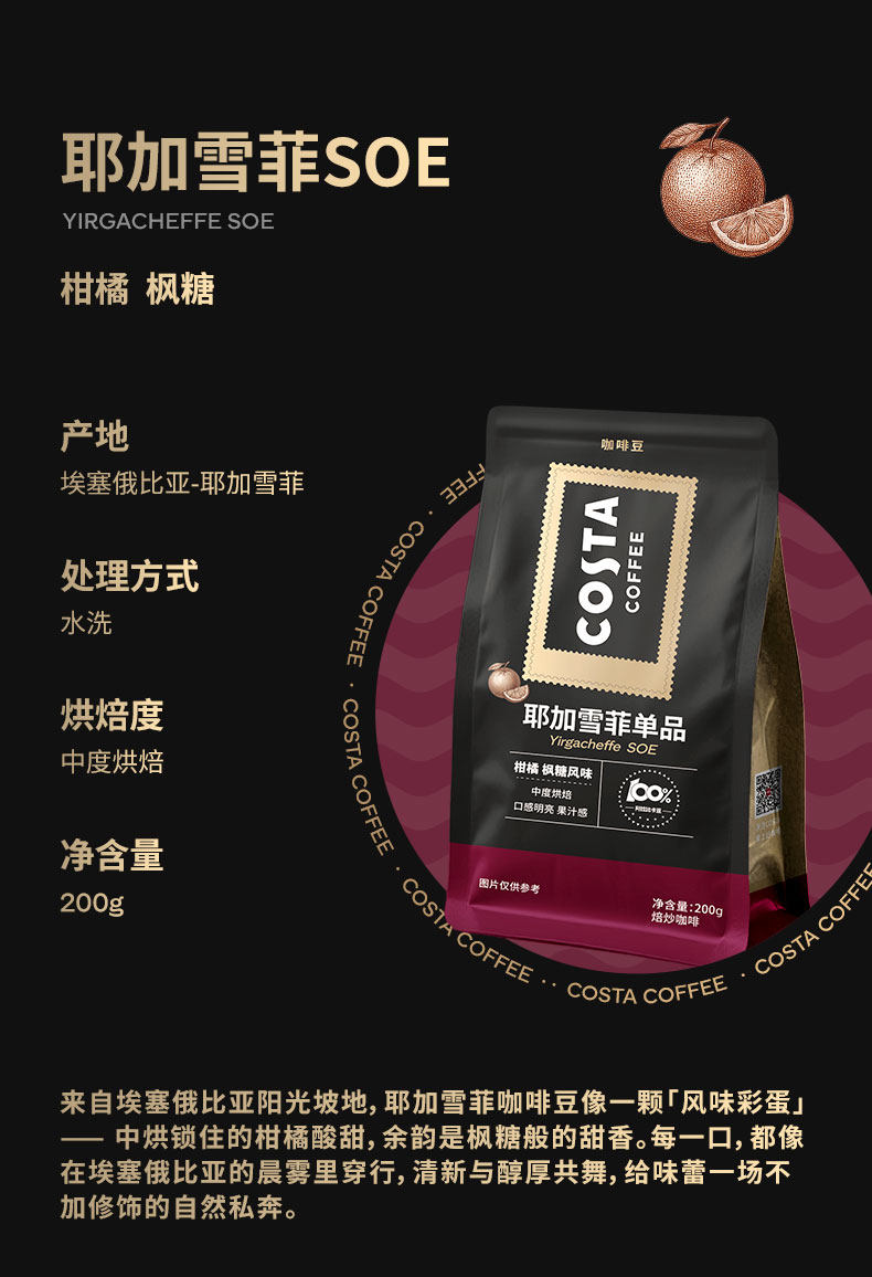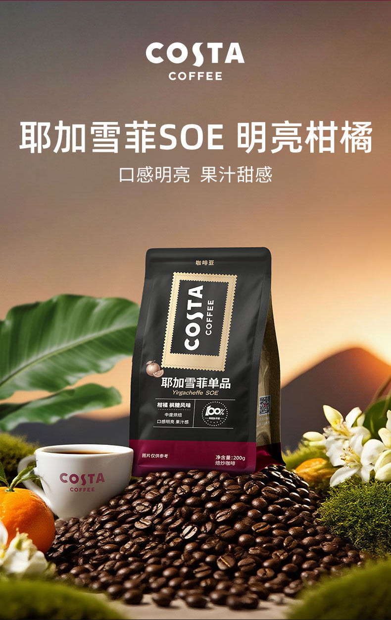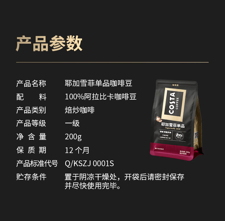 商品名称:(巨邦佑)BJ+COSTA 耶加雪菲单产地咖啡豆200g 精品中烘手冲美式