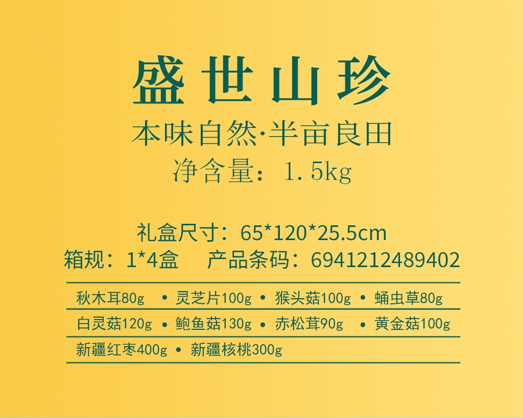 商品名称:(巨邦佑)R+半亩川盛世山珍1500g 木耳猴头菇鲍鱼菇黄金菇10拼菌菇山珍礼盒