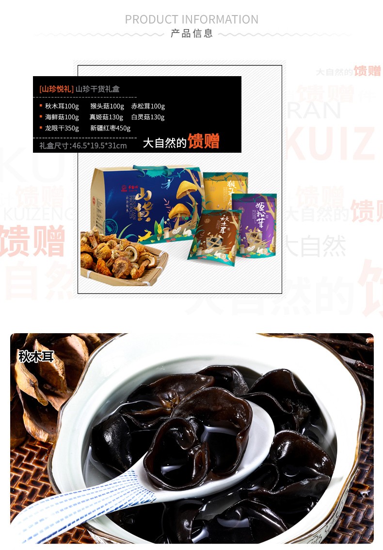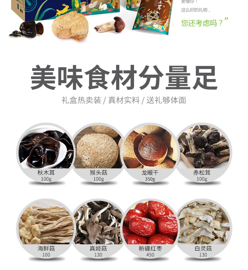 商品名称:(巨邦佑)R+半亩川山珍悦礼1460g 木耳猴头菇赤松茸8拼菌菇山珍礼盒