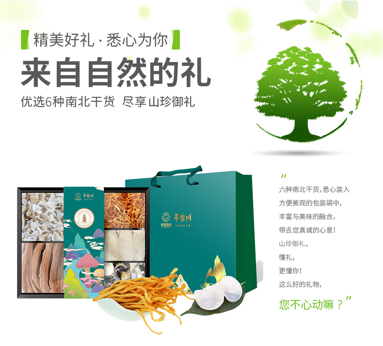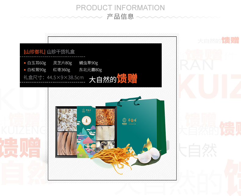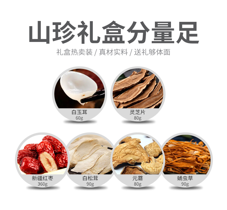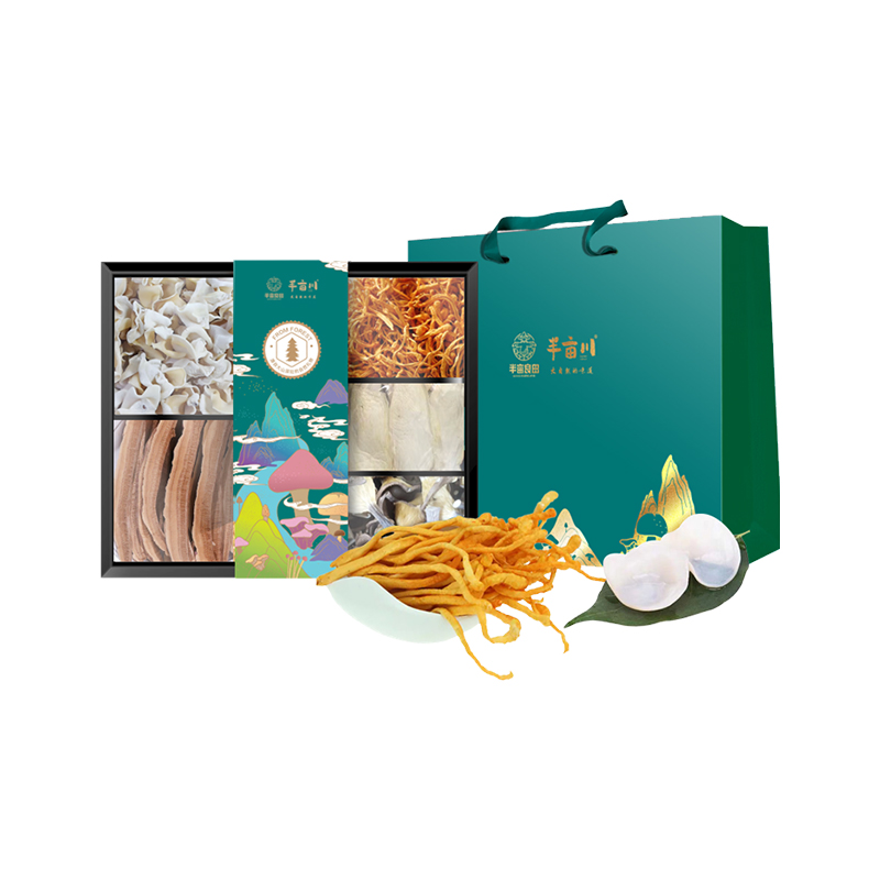 商品名称:(巨邦佑)R+半亩川半亩良田山珍御礼760g 菌菇干货山珍礼盒灵芝片元磨蛹虫草白松茸
